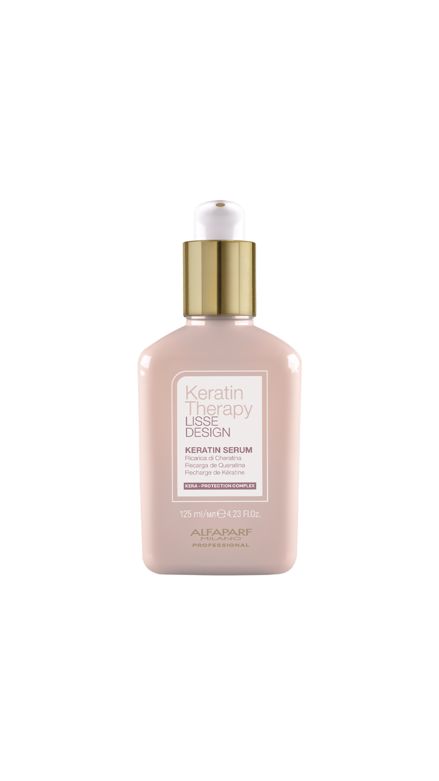 Alfaparf Milano Keratin Therapy Lisse Design Keratin Serum (125 ml) es un tratamiento capilar sin enjuague diseñado específicamente para el mantenimiento posterior a servicios de alisado profesional. Actúa como protector térmico y da una «recarga de queratina» que refuerza la fibra capilar, reduce el quiebre y prolonga los resultados del alisado hasta por 4 meses.